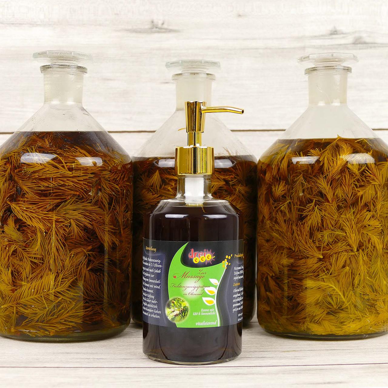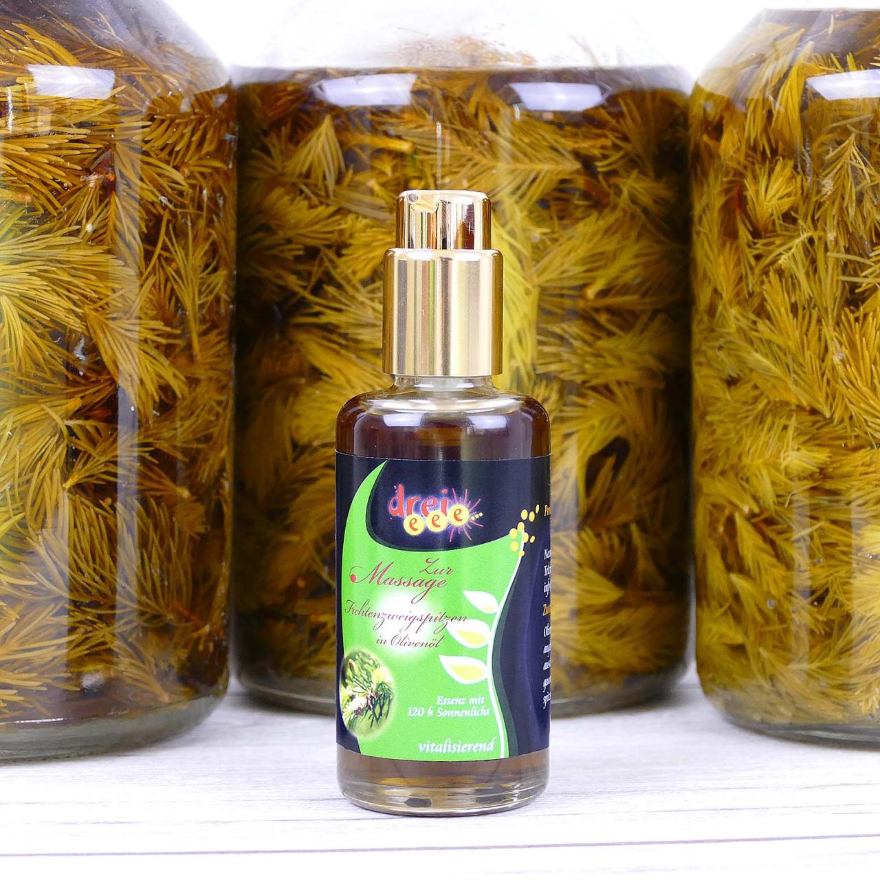 Nur junge, hellgrüne Fichtenzweigspitzen die von Mai bis Juni gesammelt werden, werden für das Fichtenzweigspitzenöl verwendet. Die jungen Fichtenzweigspitzen enthalten viele Vitamine, Mineralstoffe und wichtige sekundäre Pflanzenstoffe wie das begehrte OPC. Letzteres verstärkt die Wirkung der Vitamine A, C und E und wirkt sich allgemein positiv auf den Körper aus.