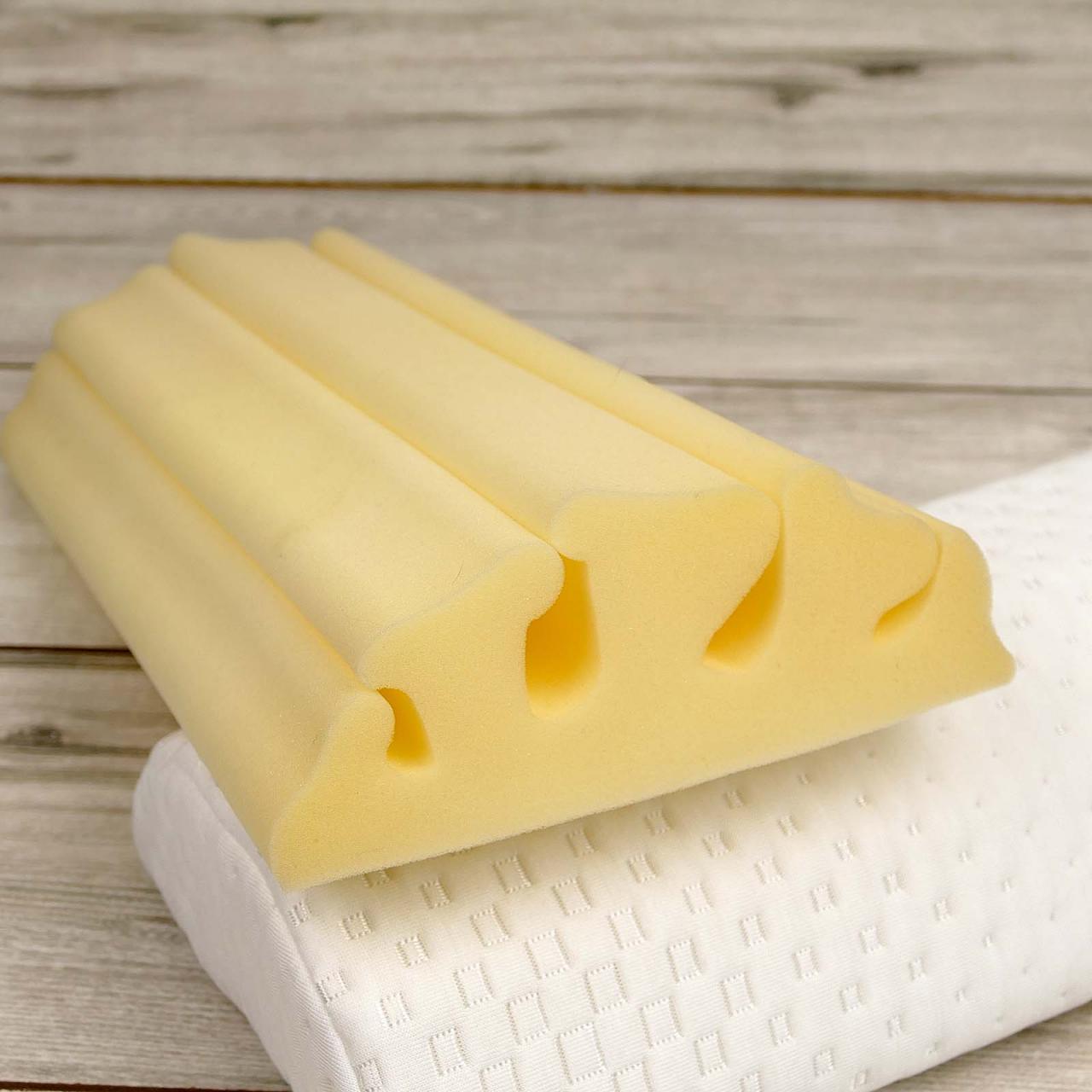 Der Schaumstoff ist antiallergisch und reagiert intelligent auf Druckbelastung. Die Lamellen des Nackenstrecker wirken als Klimazellen und vermindern die Transpiration während des Schlafes.