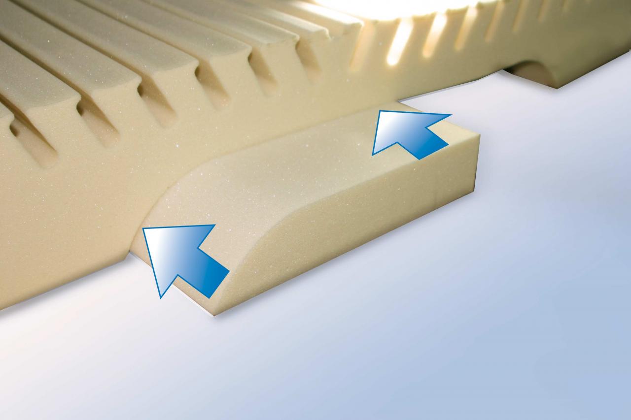 Der Schaumstoff ist antiallergisch und reagiert intelligent auf Druckbelastung. Die Lamellen wirken als Klimazellen und vermindern die Transpiration während des Schlafes.